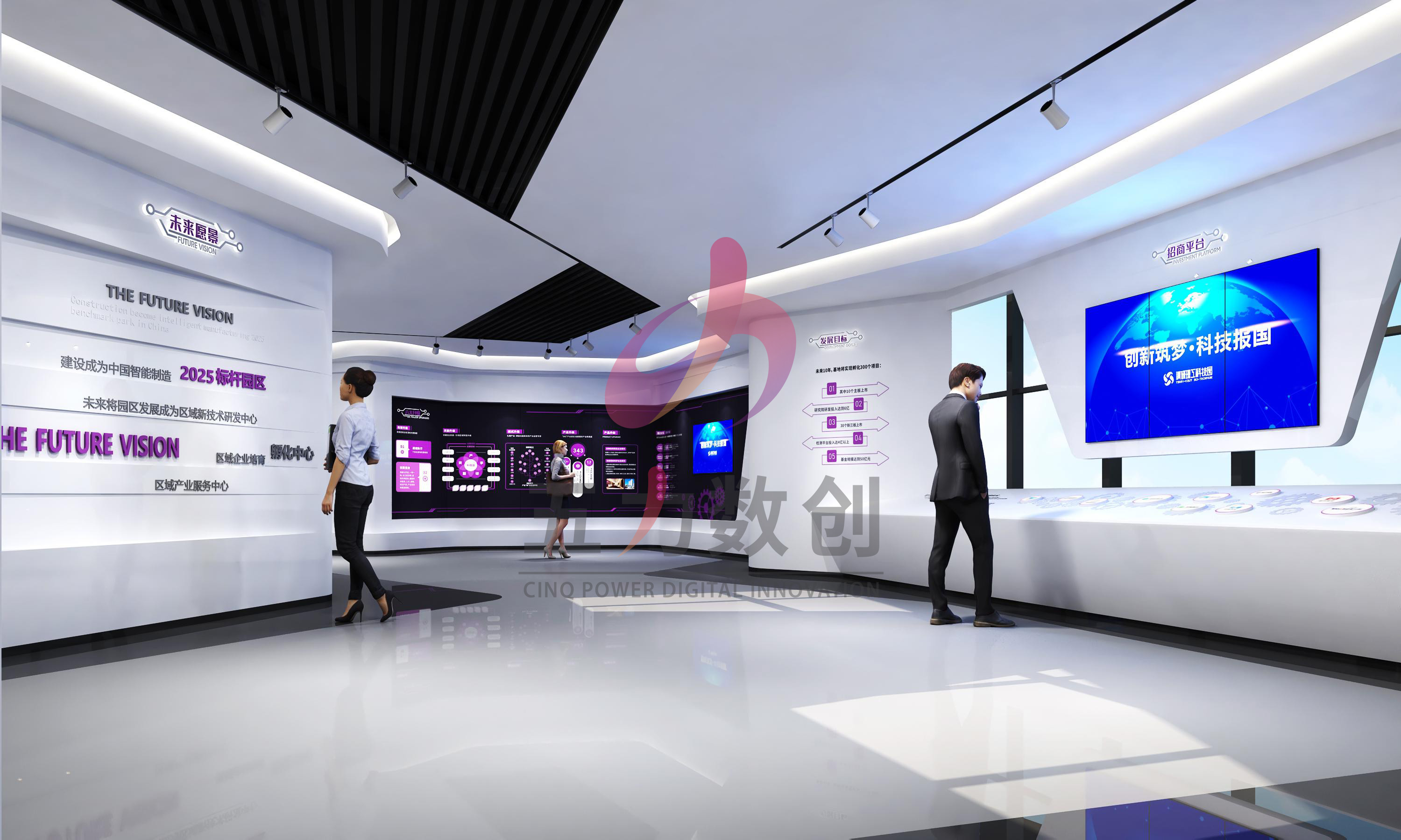 項目介紹:清研理工科技園展廳布展了繪.藍圖畢現、起.智從新來、勢.得天獨厚、擎.產業集聚四個展區區域,分別展示了園區的總體規劃戰略布局、清研體系概況和發展歷程、幾大產業成果和展望,并運用數字沙盤、弧幕、大屏、互動多媒體等多媒體高科技展項賦予展廳科技感、未來感和智慧感,致力于打造中國制造2025標桿智慧園區,吸引優質企業入駐,助力運營者招商引資,展望未來。